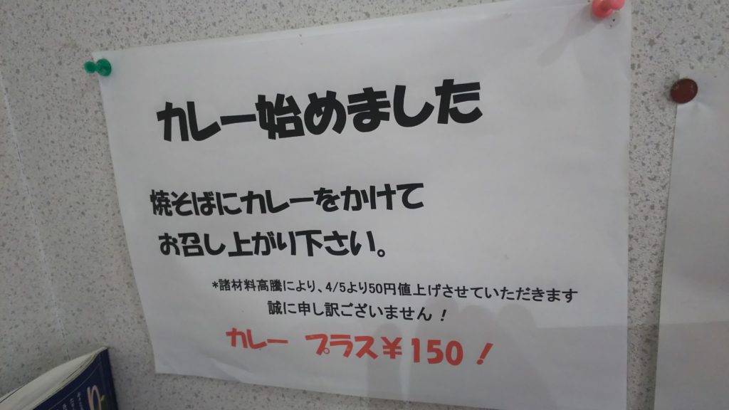 メニューはやきそば大、中、小と季節限定のカレールー!今回は焼きそば大(2.5玉)とカレールーをオーダー!