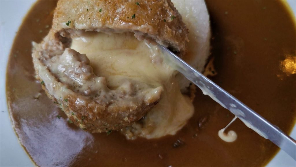 メンチカツを割るとチーズがドローンと流れ出ます!
