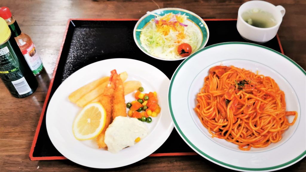スパゲティとエビフライのセットです!