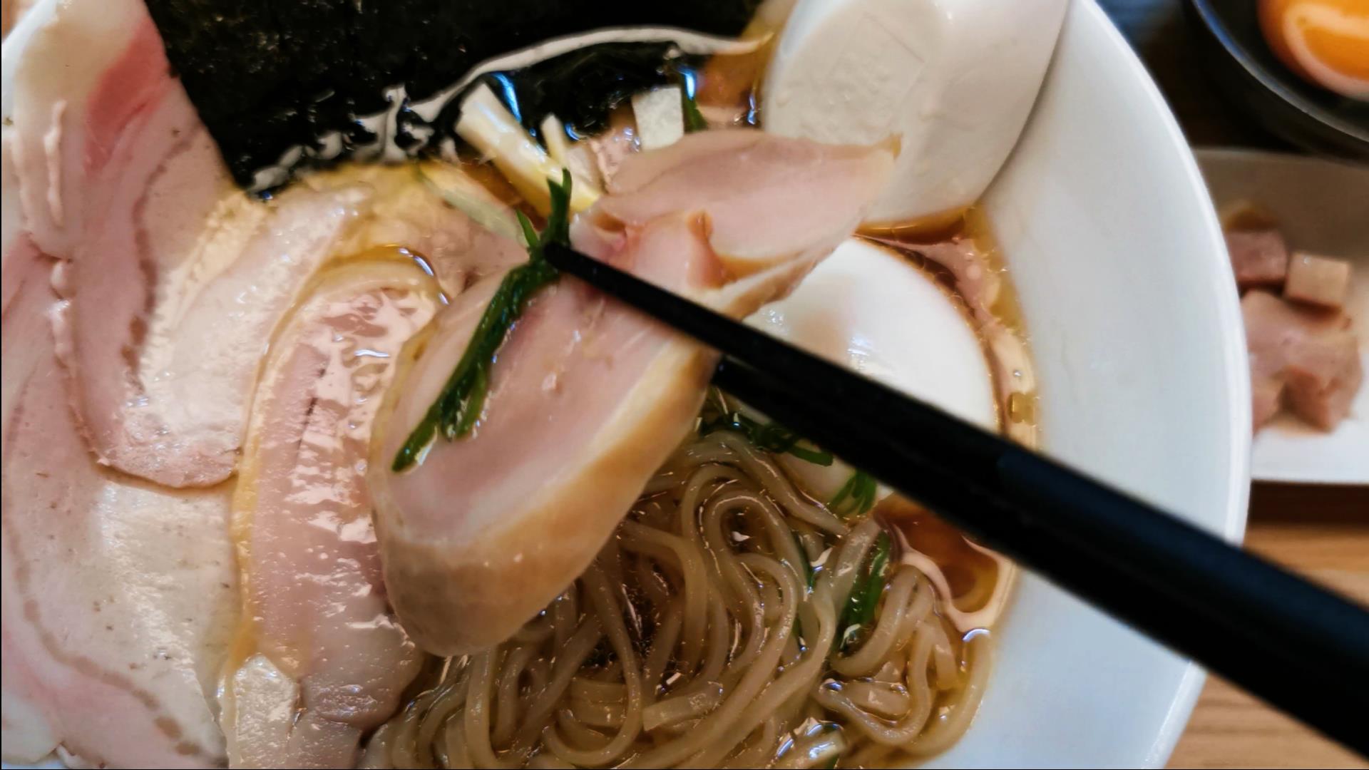 鶏のチャーシューも歯ごたえがあってうまいなあ^^
