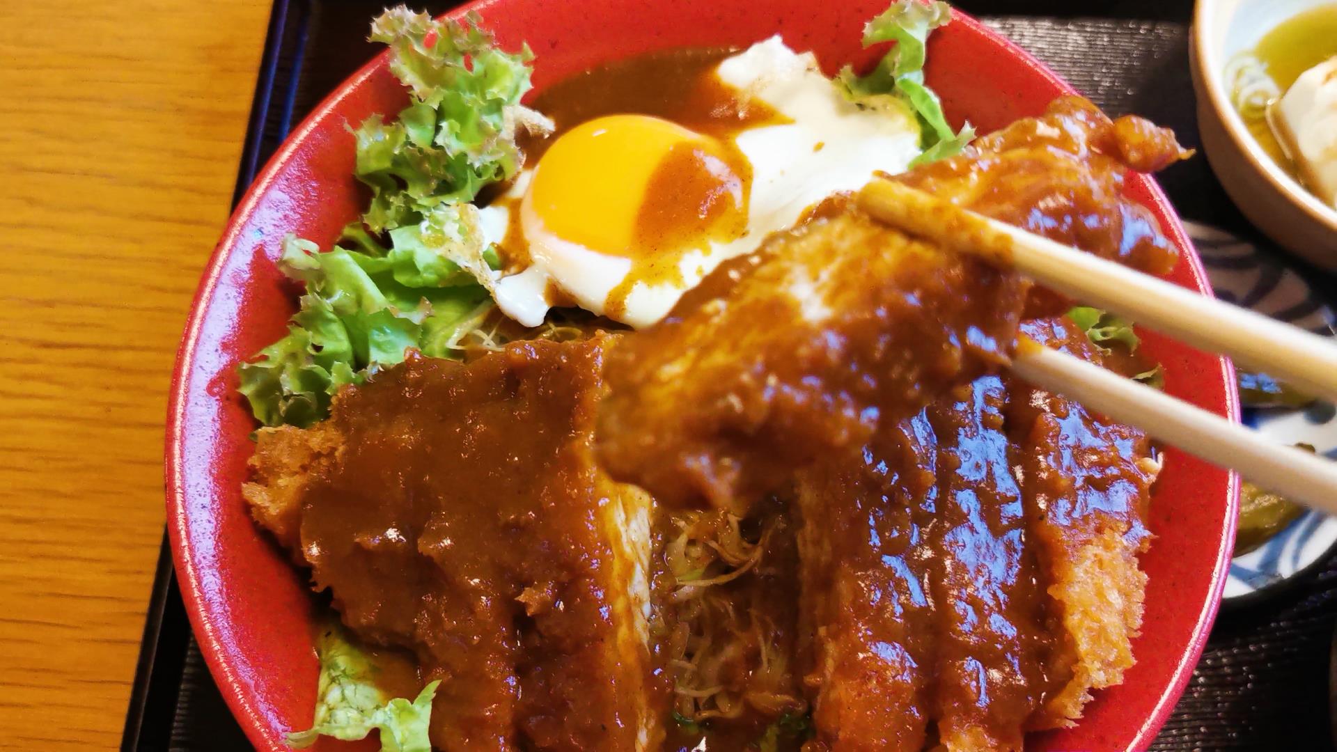 そして最終兵器目玉焼き!トンカツ、デミソース、白飯の三身一体になった時の破壊力がすさまじいい!!