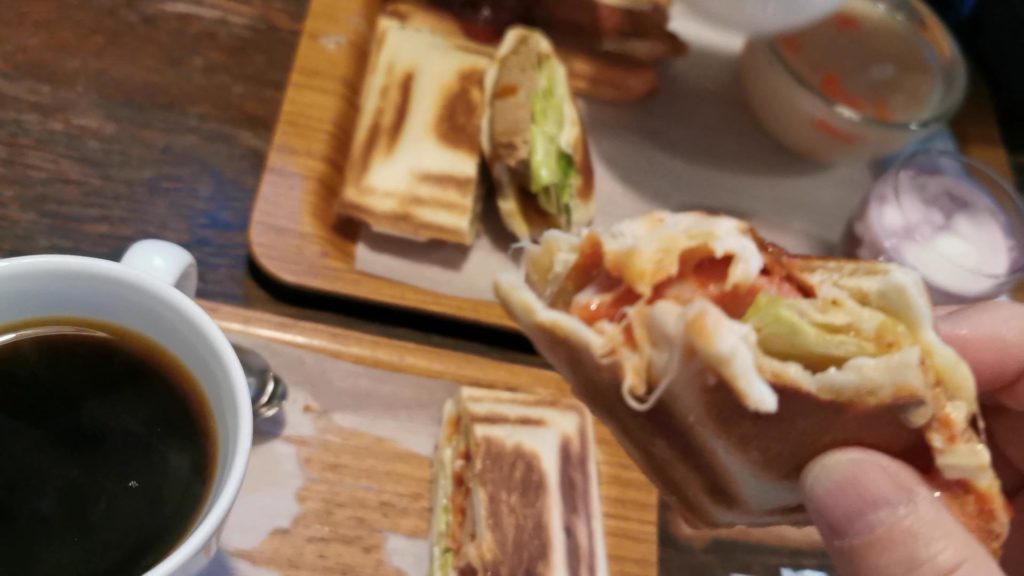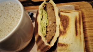 連れはポークフランク、私はハンバーグのホットサンドランチセット800円をオーダー!