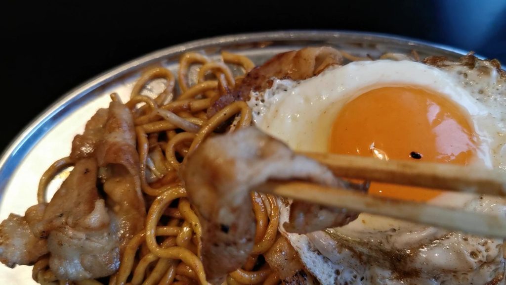 ソースをかけて目玉焼きを割って焼きそばと一緒に!
