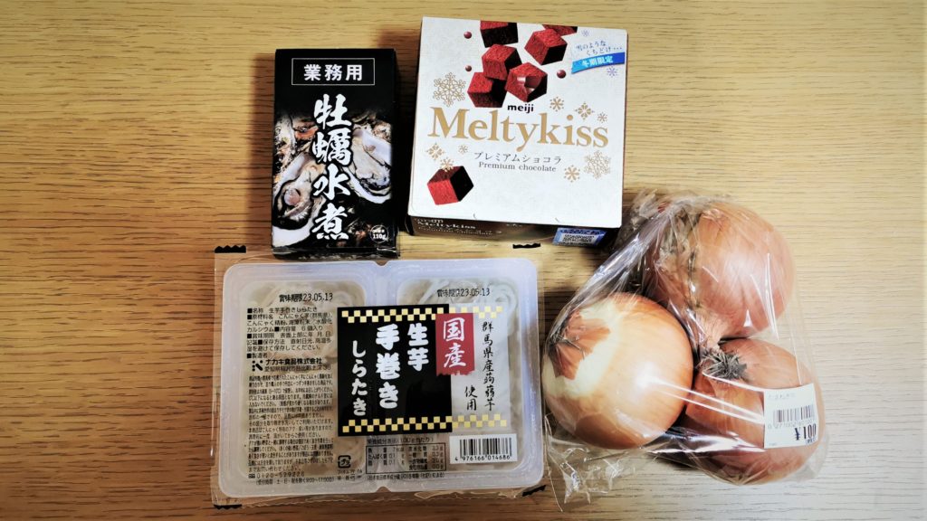 牡蠣の水煮200円、玉ねぎ100円、しらたき80円、チョコ120円!