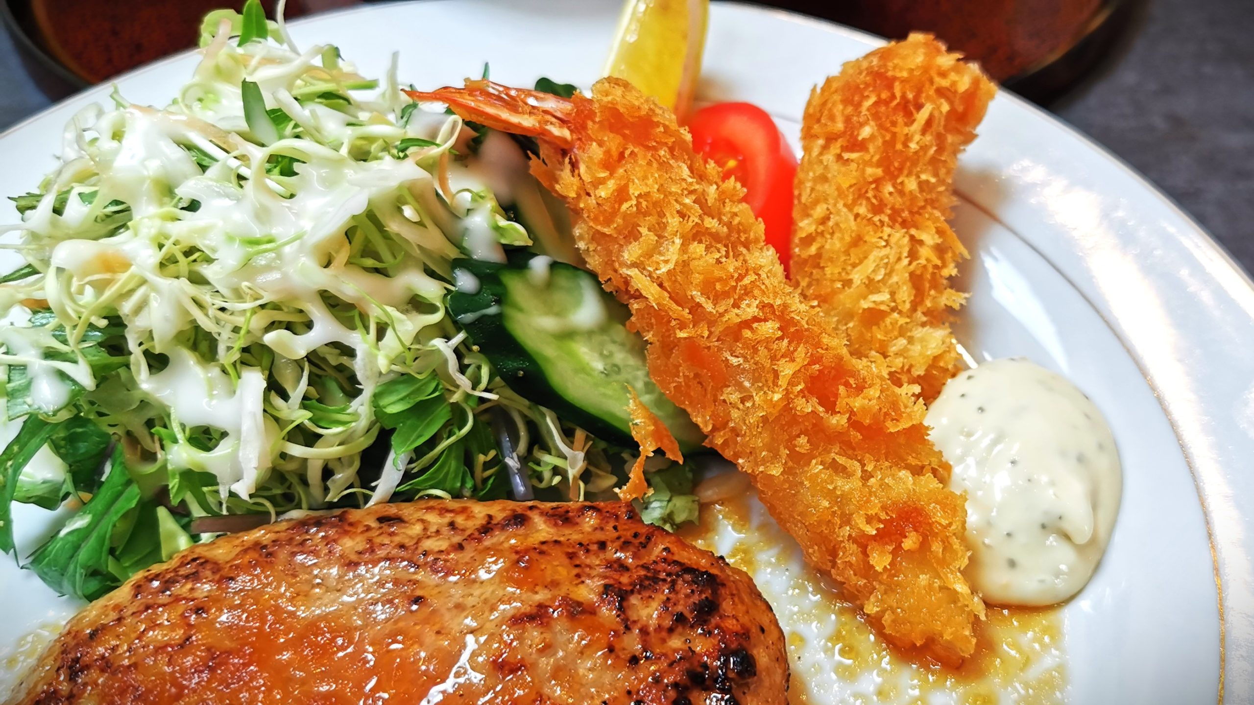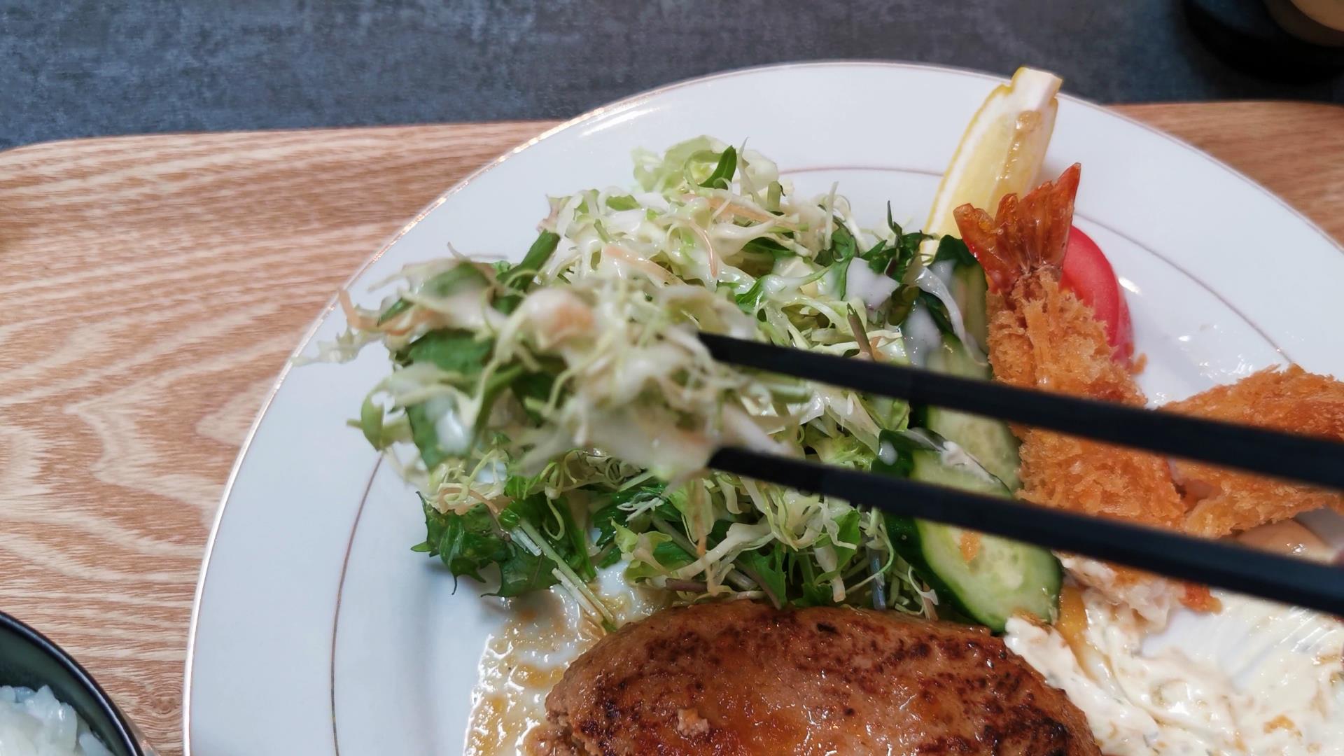 ほろ酔い豚のハンバーグとエビフライ定食1600円です!