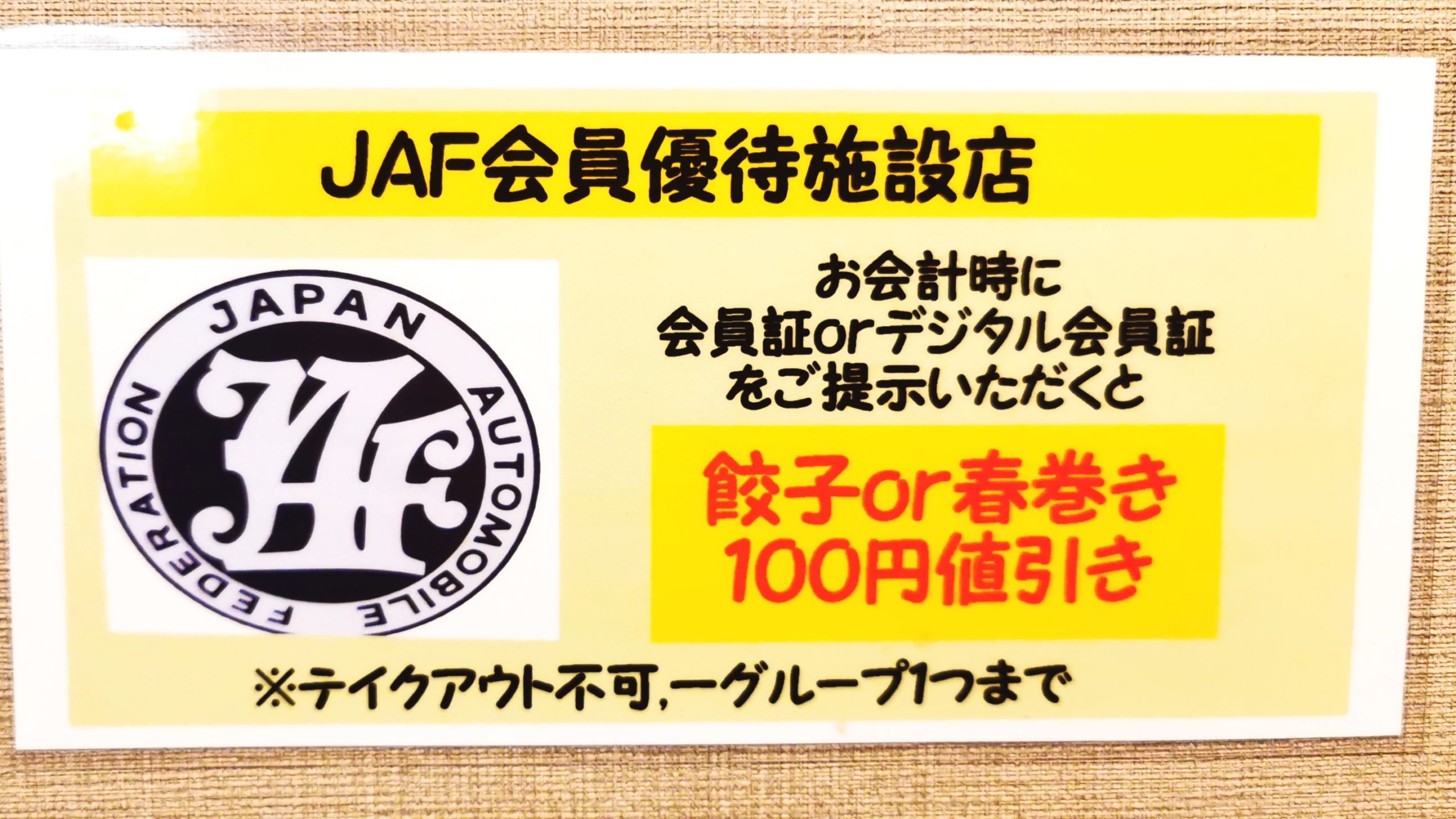 ラインの登録かJAFのカード提示で春巻きか餃子が100円引きになります!