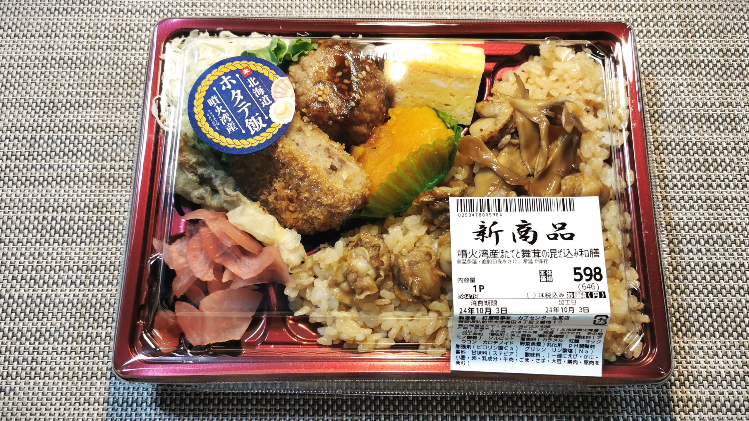 新商品、噴火湾産ほたてと舞茸の混ぜこみ和膳646円(税込)!