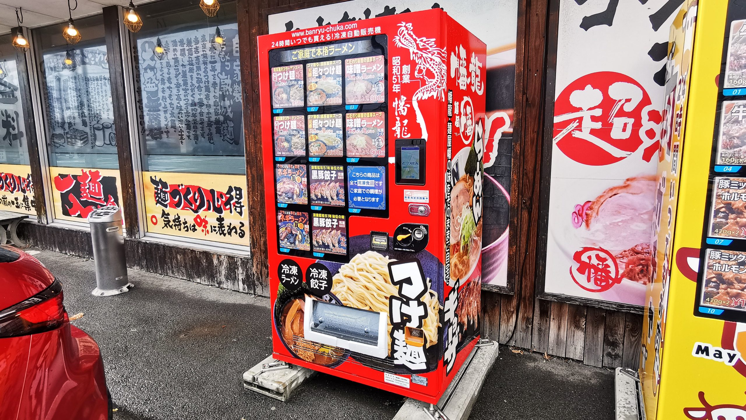 店の前には肉の石岡と幡龍さんのラーメン自販機!