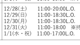 12月31日、1月1日11:00~15:001月2日~通常営業です!