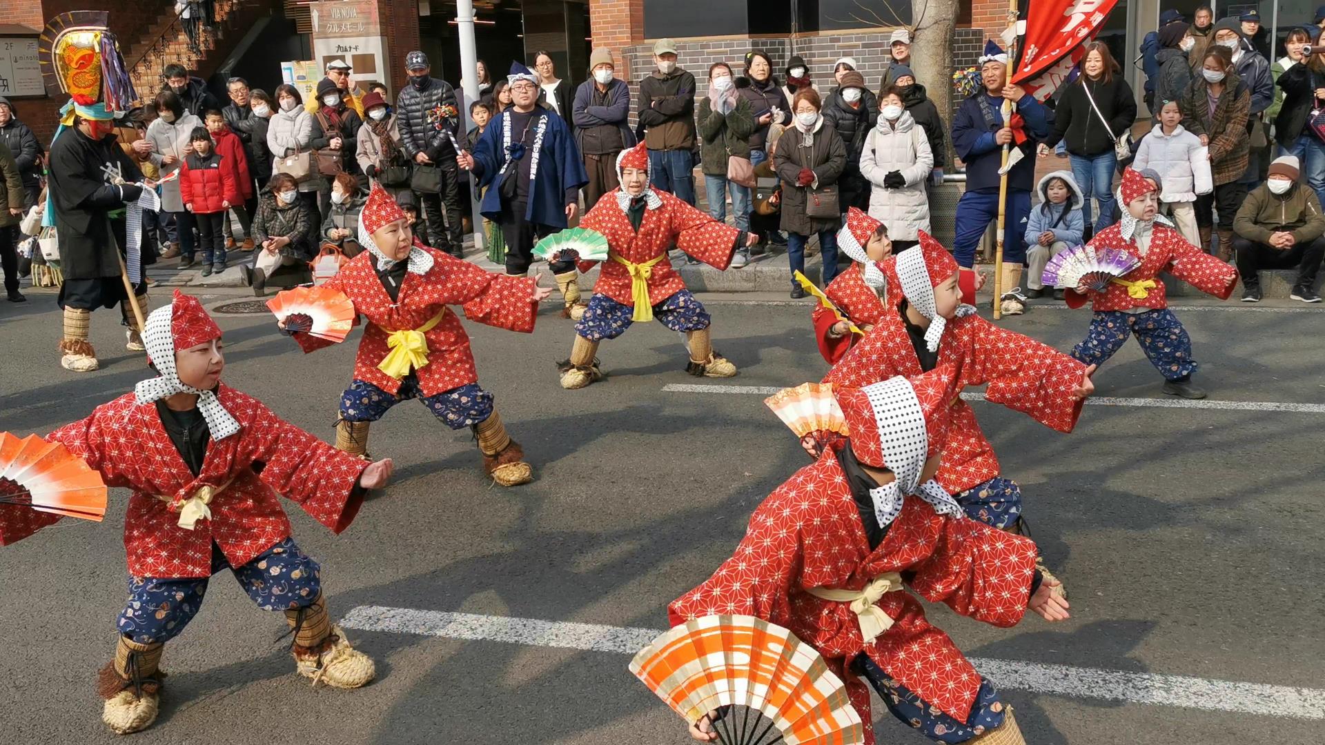 初日の八戸市中心街へ移動した三十数組のえんぶり組が一斉に舞い踊る「一斉摺り」(いっせいずり)!
