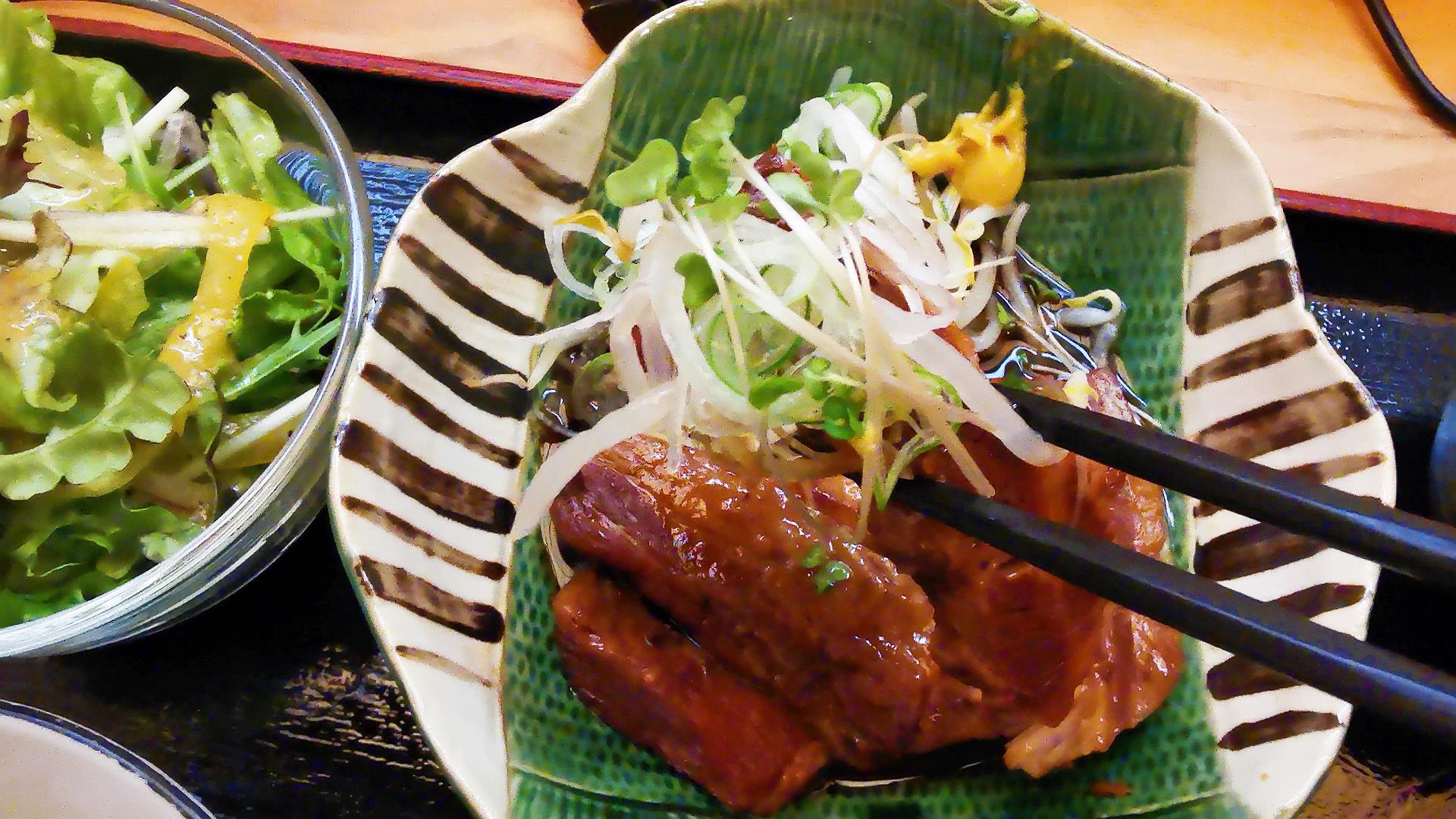 大き目な角煮2枚と小鉢2品と野菜サラダ!