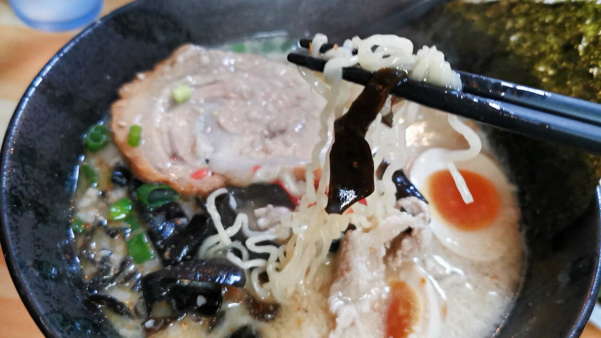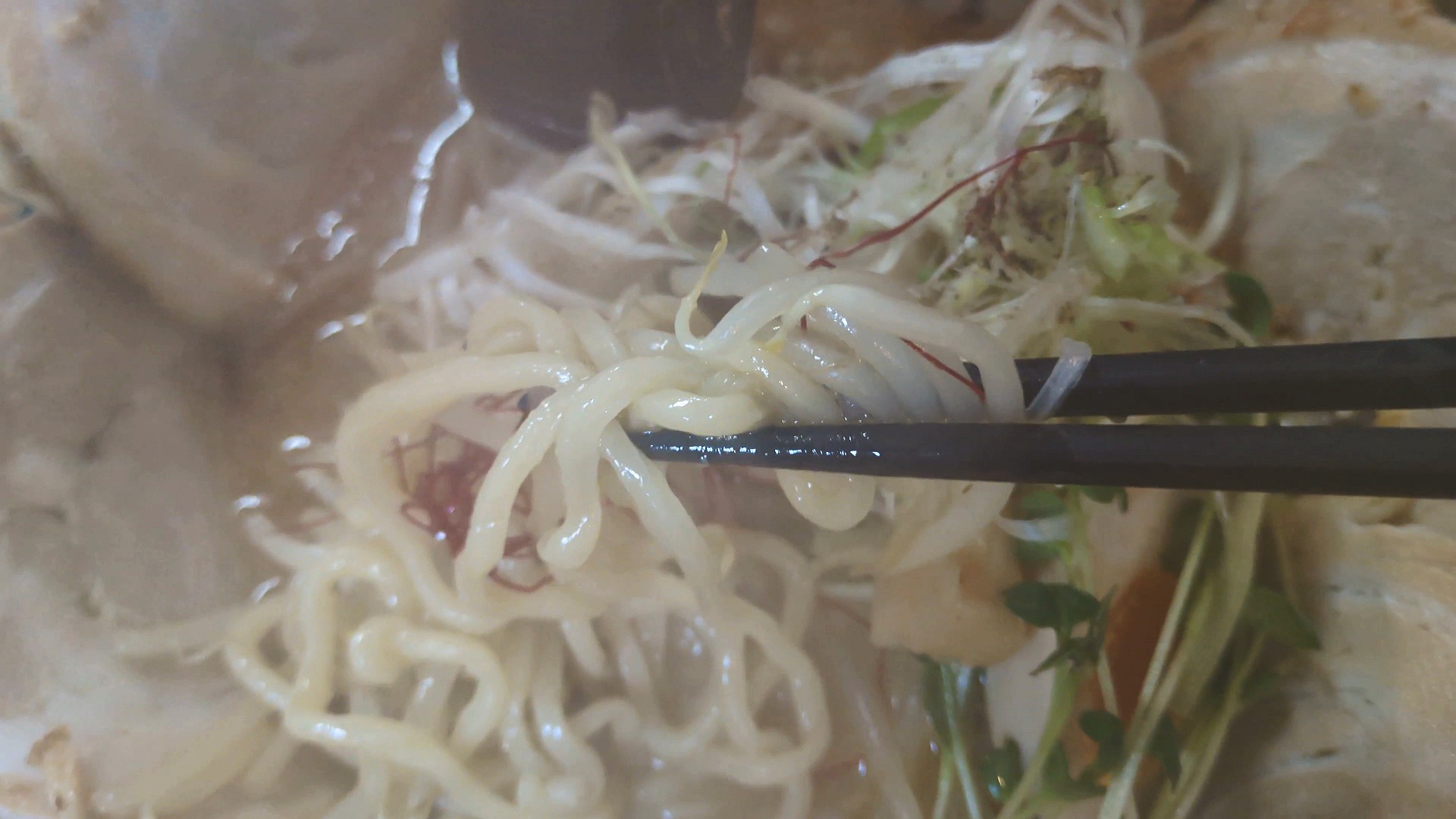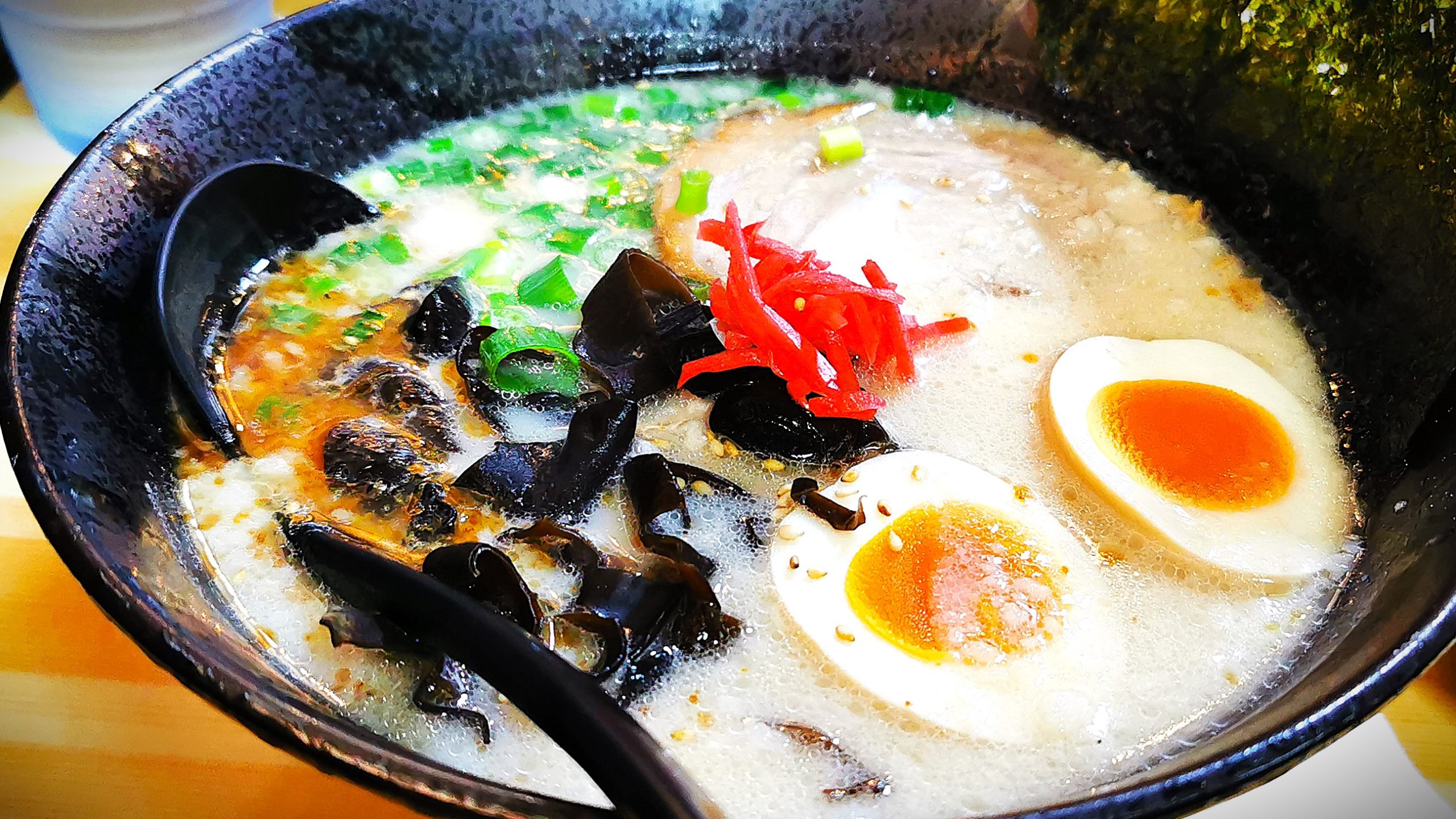 おいしそうな豚骨ラーメン、辛いニラ付きです!