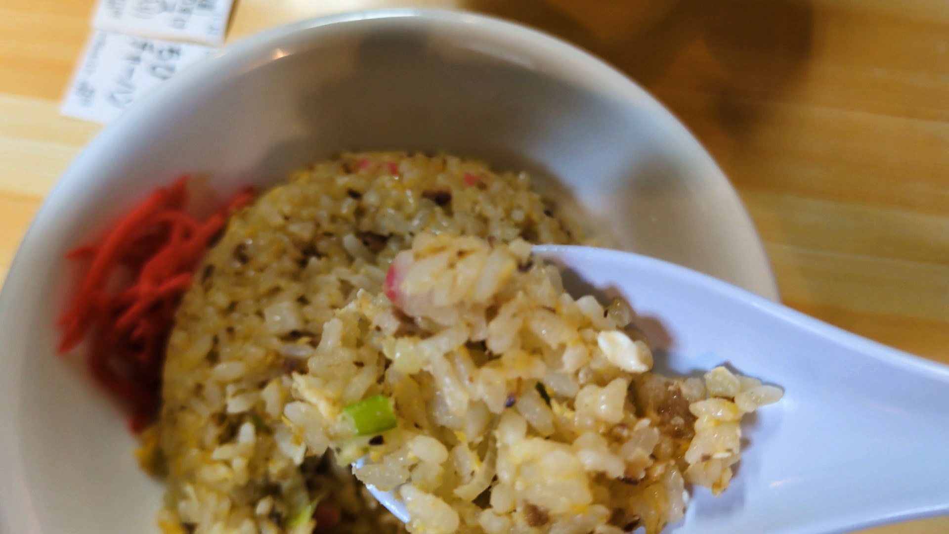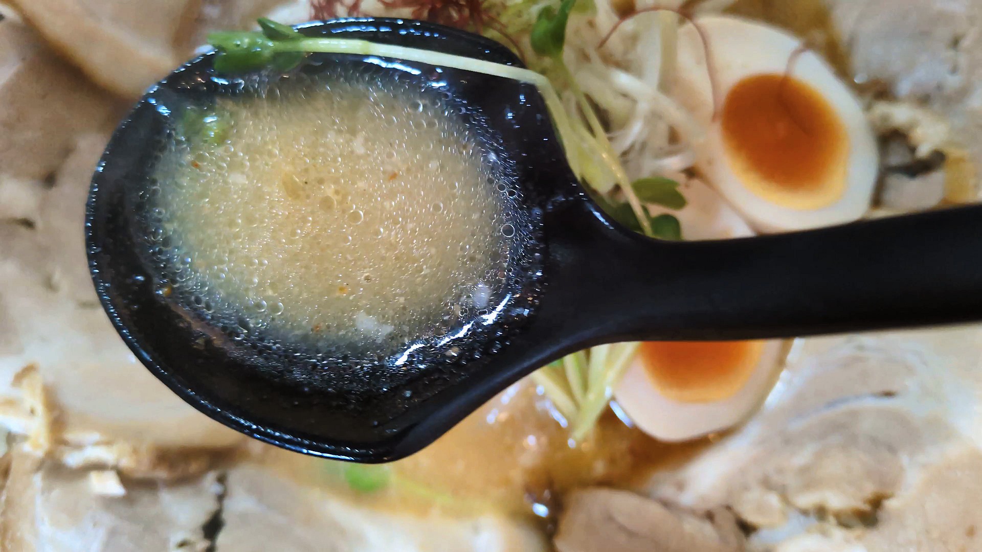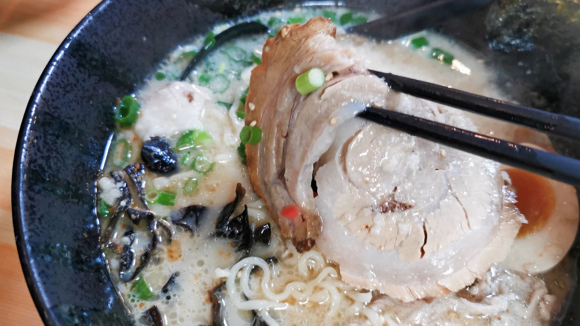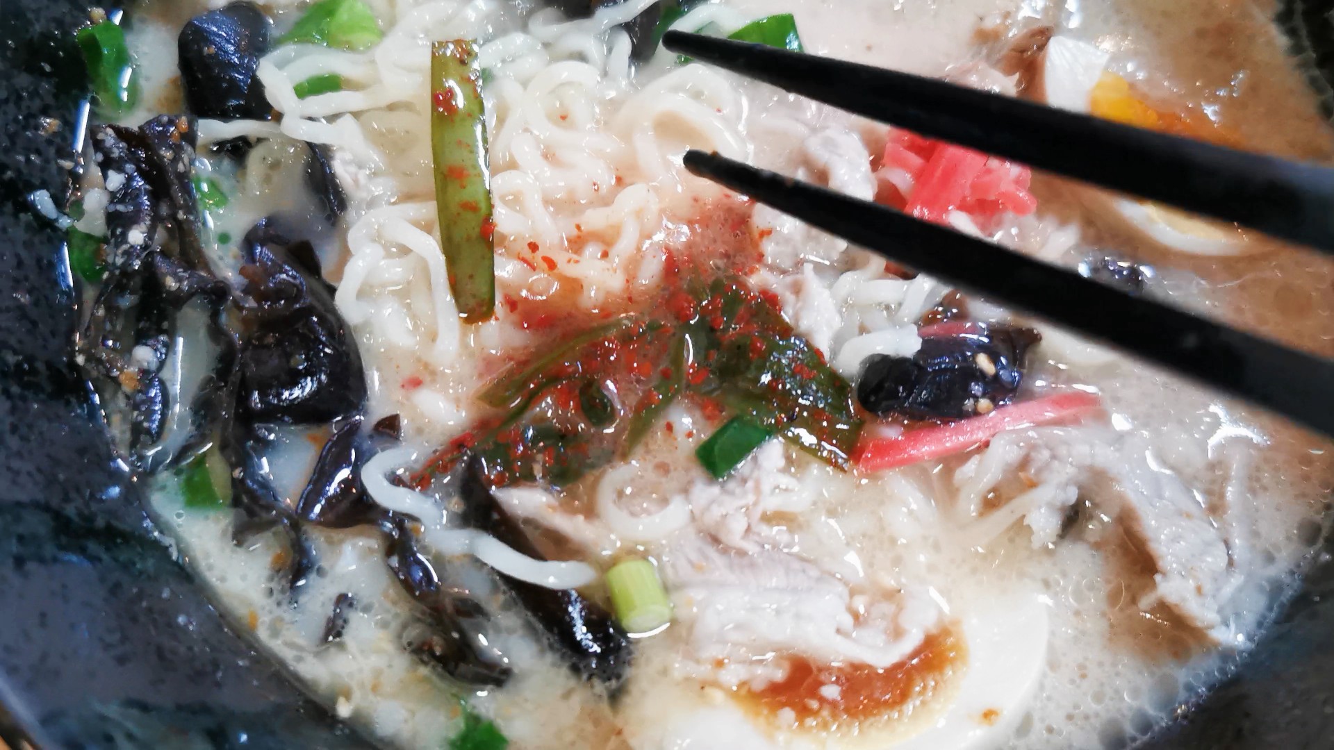 おいしそうな豚骨ラーメン、辛いニラ付きです!