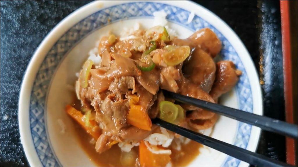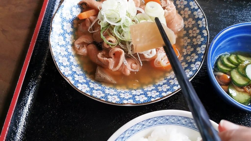 こちらは醤油味のモツ煮定食1000円です!