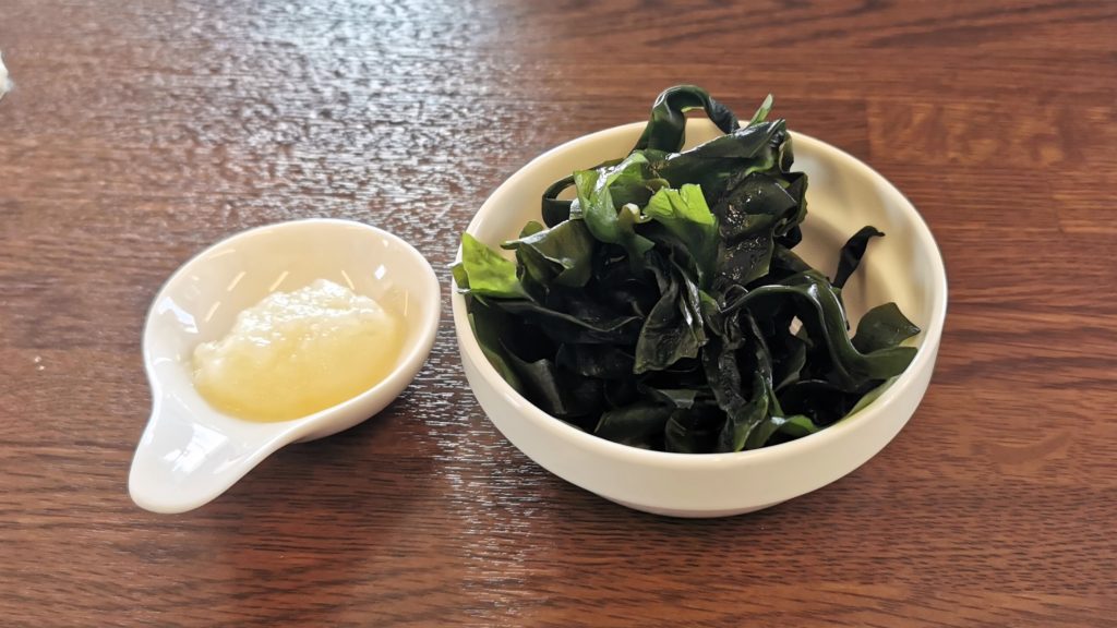 すりおろしニンニクとワカメ、ご飯の友醤油ニンニクを準備!